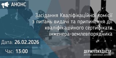 Повідомлення про проведення засідання Кваліфікаційної комісії з питань видачі та припинення дії кваліфікаційного сертифіката інженера-землевпорядника 26 лютого 2026 року