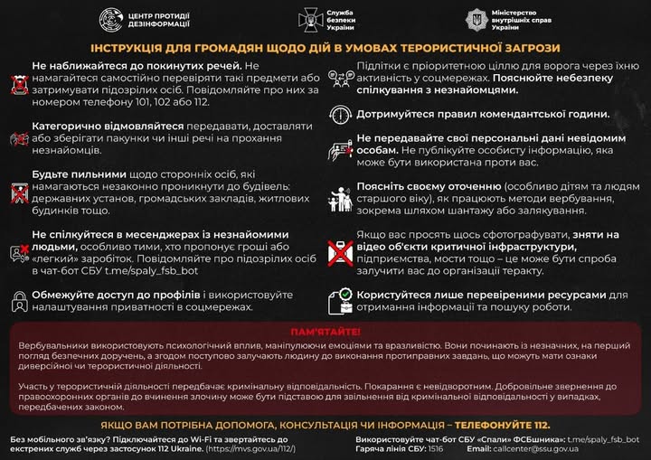 Центр протидії дезінформації спільно зі Службою безпеки України та Міністерством внутрішніх справ України розробили для громадян інструкцію щодо дій в умовах терористичної загрози, яка допоможе вчасно розпізнати небезпеку та захистити себе.