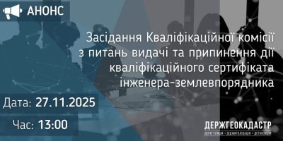Повідомлення про проведення засідання Кваліфікаційної комісії з питань видачі та припинення дії кваліфікаційного сертифіката інженера-землевпорядника 27 листопада 2025 року