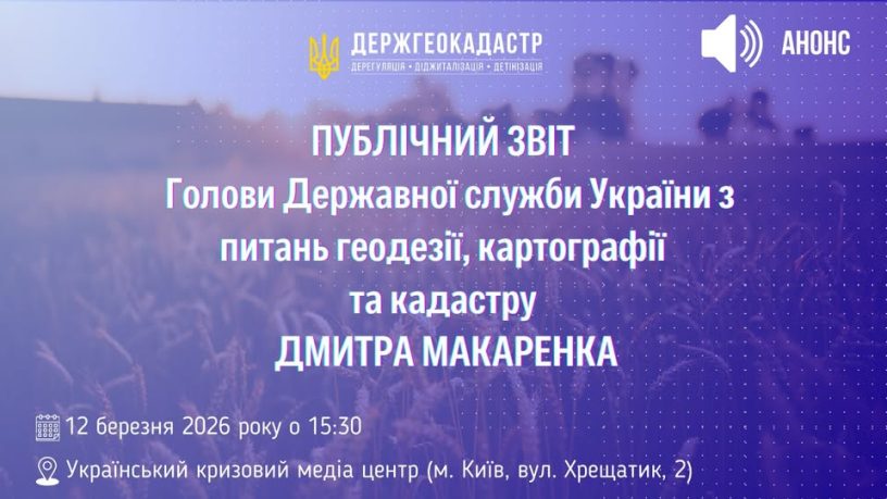 12 березня 2026 року відбудеться публічний звіт Голови Державної служби України з питань геодезії, картографії та кадастру Дмитра Макаренка про підсумки роботи Держгеокадастру за 2025 рік.